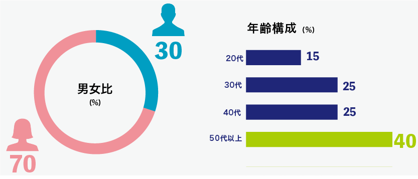 中高年層(50代~70代)が中心ですが、近年は若い世代(20代~30代)の